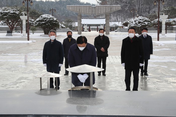 이날 참배는 코로나 19 상황을 감안해 최소 인원으로 김한종 의장을 비롯해 구복규 부의장과 전경선 운영위원장이 참석하여 국화 헌화에 이어 분향‧묵념을 했다.