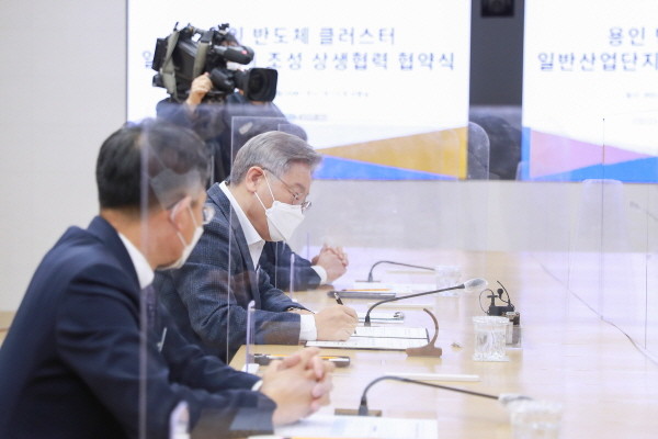 이재명 경기도지사와 김보라 안성시장, 백군기 용인시장, 김동섭 SK하이닉스㈜ 대외협력총괄 사장, 안재현 SK건설㈜ 대표이사, 정철 용인일반산업단지㈜ 대표이사는 11일 경기도청에서 이런 내용을 담은 ‘용인 반도체 클러스터 일반산업단지’ 조성 상생협력 협약을 맺고 성공적인 산업단지 조성을 위해 협력하기로 했다.