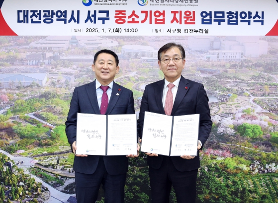 대전 서구는 7일 구청 갑천누리실에서 대전일자리경제진흥원과 서구 중소기업의 성장과 지원, 경쟁력 강화를 위한 업무협약(MOU)을 체결했다.