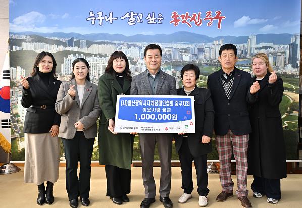 (사)울산광역시지체장애인협회 중구지회가 2월 13일 오전 10시 중구청 구청장실을 찾아 울산사회복지공동모금회를 통해 이웃돕기 후원금 100만 원을 전달했다.