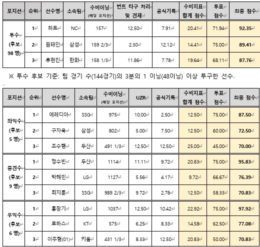| ▲ 2024 KBO 수비상 투수, 외야수 부문 결과 |