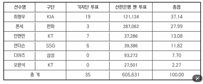 기자단 투표 총 35표 중 19표(54.3%), 팬 투표 60만 5,631표 중 12만 1,124표(20%)로 총점 37.14점을 받은 최형우는 기자단 투표 3표, 팬 투표 28만 7,062표로 총점 27.99점을 기록한 한화 폰세를 제치고 5월 월간 MVP로 선정됐다.