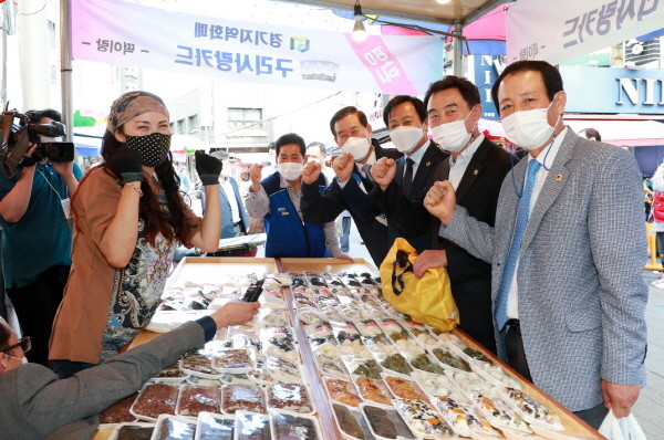 의원들은 먼저 점포수 388개, 상인 919명 규모의 전통시장을 둘러보며 온누리 상품권으로 정육, 떡, 건어물, 과일, 강정 등 명절 먹거리를 구입하고, 농산물 가격상승으로 어려움을 겪고 있는 시장 상인들에게 격려의 메시지를 전했다.