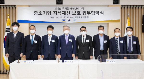 이재명 경기도지사는 19일 경기도청에서 김용래 특허청장, 홍장원 대한변리사회장과 이 같은 내용의 ‘중소기업 기술탈취 근절 및 지식재산 보호를 위한 업무협약’을 체결했다.