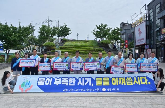 강릉시의회 최익순 의장을 비롯한 시의원들은 9일 강릉월화거리에서 물부족 비상에 따른 ‘물 절약 실천 캠페인’을 실시하며 시민들에게 물 아껴쓰기에 동참해줄 것을 호소했다.