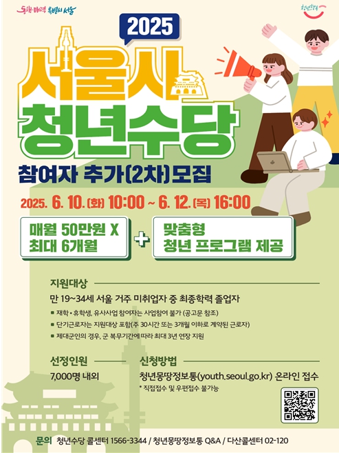 서울시는 더 많은 청년의 사회진입을 돕고자 6월 10일 오전 10시부터 12일 16시까지 청년수당 참여자 7,000여 명을 추가로 모집한다고 밝혔다. 청년수당은 미취업 청년을 대상으로 매월 50만 원씩 최대 6개월간 활동 지원금과 취업 준비에 도움이 되는 맞춤형 프로그램을 제공하는 사업이다.