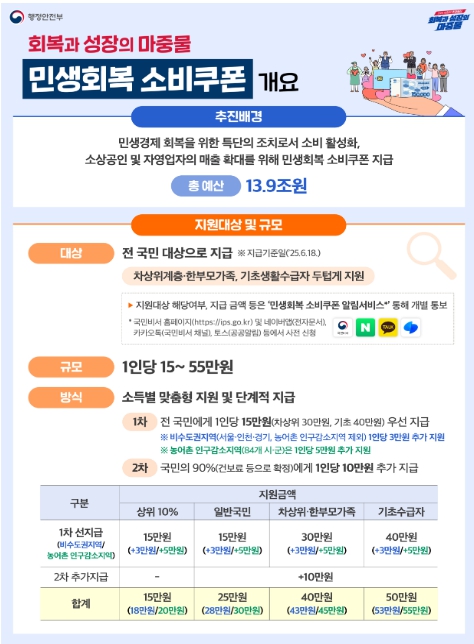 민생회복 소비쿠폰 범정부 TF 단장인 김민재 행정안전부 차관은 “우리 경제의 회복을 위한 마중물로서 민생회복 소비쿠폰이 전반적인 소비 활성화와 어려운 분들에 대한 소득 지원이라는 두 마리 토끼를 모두 잡을 수 있도록 차질 없는 집행을 철저히 준비하겠다”고 밝혔다.