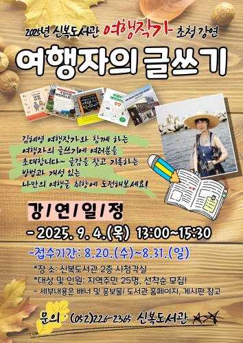 울산 남구 신복도서관은 9월 4일 오후 1시 신복도서관 2층 시청각실에서 김혜영 작가와 함께하는 ‘여행자의 글쓰기’ 강연을 개최한다.