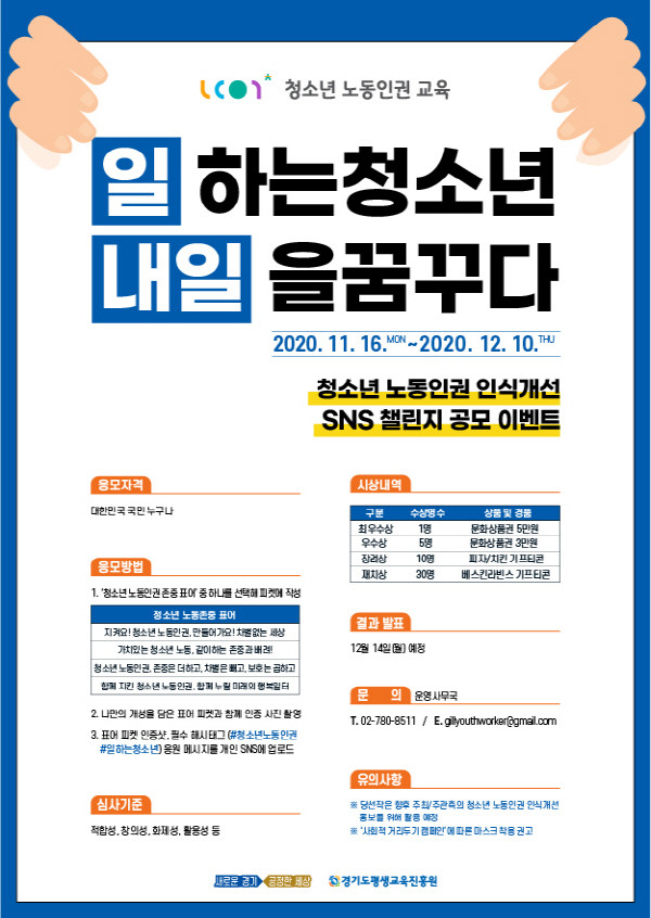 박준호 경기도 평생교육과장은 “이번 이벤트가 더 많은 사람들이 청소년 노동인권에 대해 관심을 가지고 노동존중에 대한 사회적 분위기 조성에 기여할 수 있는 계기가 되길 바란다”고 말했다.