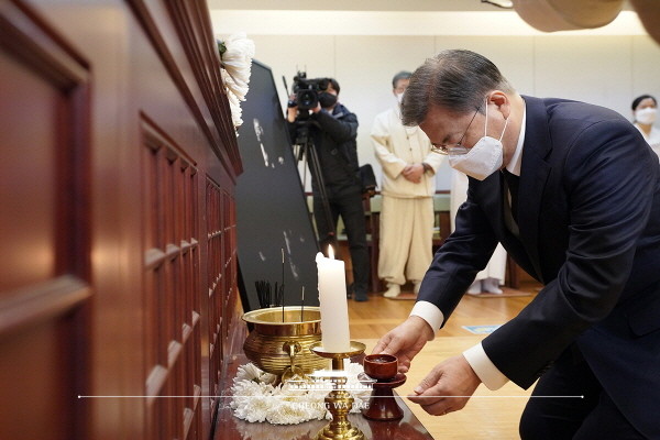 대통령은 묵념 후 영전에 국화와 술잔을 올린 뒤 절 하고, 유족들을 위로했다.