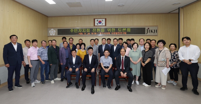 청주시의회 의원 연구단체 ‘의정발전연구회’(대표 김태순 의원)가 26일 시의회 특별위원회실에서 '주민자치회 전환을 위한 토론회'를 개최했다.