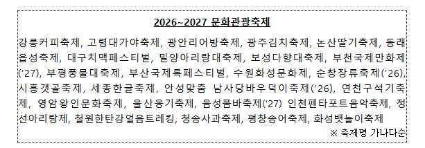 ‘2026~2027 문화관광축제’는 지난 2년간 전문가와 소비자, 지역주민 평가 결과와 바가지요금 등 부정적 문제 여부, 수용 태세 등을 종합적으로 고려해 선정했다.