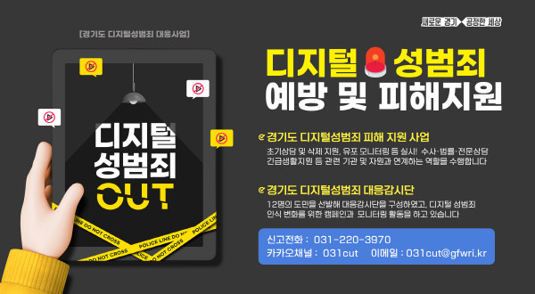 이밖에도 도는 지난 9월부터 각종 영상미디어를 통해 디지털성범죄 피해자에 대한 지원책을 홍보하는 한편 디지털성범죄 근절 사이버 교육 콘텐츠를 제작해 11월부터 경기도 공직자와 공공기관 임직원을 대상으로 디지털성범죄 예방 및 근절 교육도 실시할 계획이다.