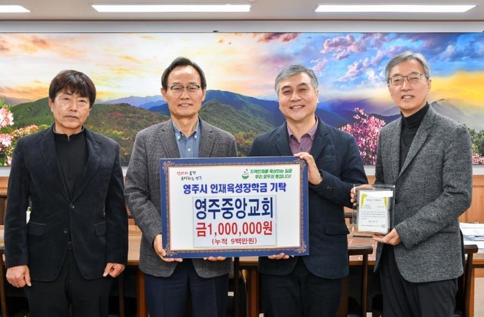 (재)영주시인재육성장학회는 지난 7일 영주중앙교회가 지역 인재 양성을 위해 100만 원을 기탁했다고 밝혔다.
