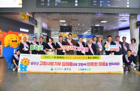 울산 울주군이 추석을 앞두고 25일 KTX울산역에서 NH농협은행 울주군지부, 울주군 지역농협·울산원협·울산축협과 합동으로 고향사랑기부제 홍보 캠페인을 실시했다.