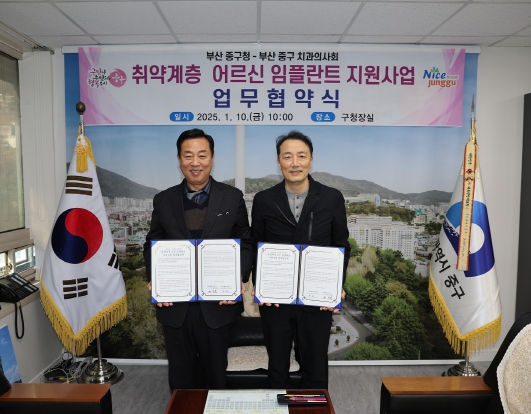 부산 중구는 지난 10일 '취약계층 노인 임플란트 본인부담금 지원사업'의 안정적인 추진을 위해 부산 중구 치과의사회와 업무협약을 체결했다.