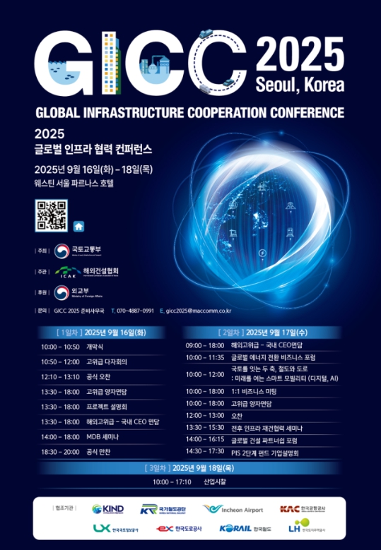 국토교통부가 주최하고 해외건설협회(회장 한만희)가 주관하는 ‘글로벌 인프라 협력 콘퍼런스(Global Infrastructure Cooperation Conference, GICC) 2025’가 9월 16일 오전 10시 개막식을 시작으로 3일간 웨스틴 서울 파르나스 호텔(삼성동 소재)에서 개최된다.