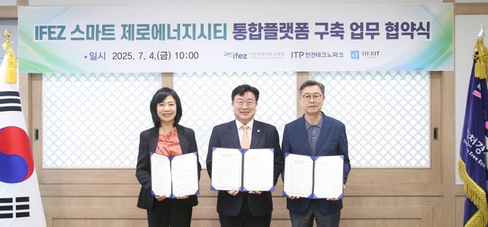 인천경제자유구역청(청장 윤원석)은 7월 4일 송도국제도시 G타워에서 인천테크노파크, 에너지사업자인 ㈜헤리트와 ‘IFEZ 스마트 제로에너지시티 통합플랫폼 구축’을 위한 업무협약을 체결했다고 밝혔다.