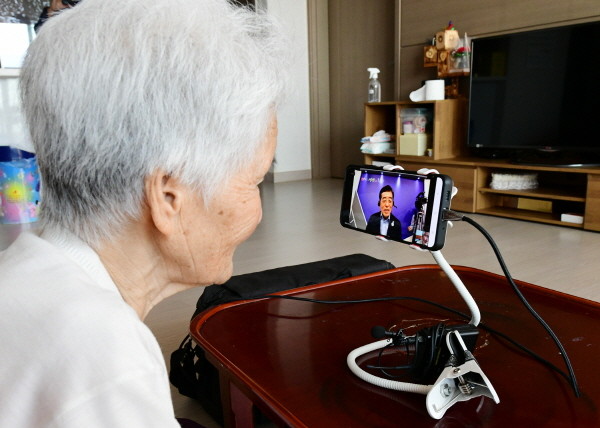 코로나바이러스감염증-19(코로나19) 사태로 직접 찾아뵙기 어려운 상황을 고려해 단원구 선부동에 거주하는 홍 어르신도 미리 스마트폰을 전달 받아 윤화섭 시장과 비대면으로 인사를 건넸다.