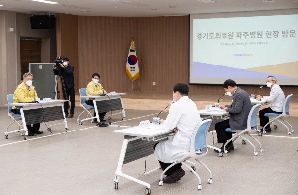 이재명 지사는 이날 오후 경기도의료원 파주병원을 방문해 병원 입구에 마련된 선별진료소를 둘러본 뒤 현장 의료진에게 감사를 표했다.