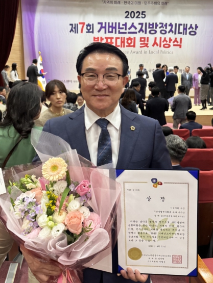 전북특별자치도의회 강태창 의원(기획행정위원회, 군산1)이 지난 23일 국회의원회관에서 열린 ‘2025 제7회 거버넌스지방정치대상’ 주민편익증대 분야에서 우수상을 수상했다.