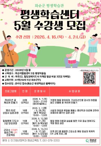 화순군은 찾아가는 전남형 평생학습 공모사업과 연계해 군민의 자기계발과 건강한 여가 활동 지원을 위해 ‘5월 평생학습센터 프로그램’ 수강생을 모집한다고 밝혔다.