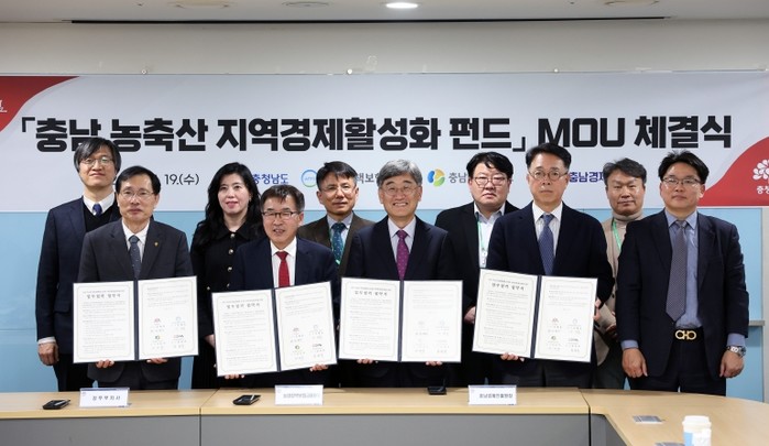 충남도는 19일 도청에서 농업정책보험금융원, 충남테크노파크, 충남경제진흥원과 ‘충남 농축산 지역경제 활성화 펀드’ 업무협약(MOU)을 체결했다.