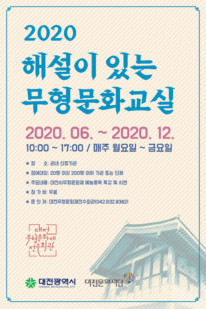 ‘해설이 있는 무형문화교실’은 대전무형문화재의 이해를 돕고 전통문화의 우수성을 알리기 위한 프로그램으로 판소리, 웃다리농악, 매사냥, 승무 등 예능종목 보유자(전수교육조교)의 특강과 시연을 제공한다.