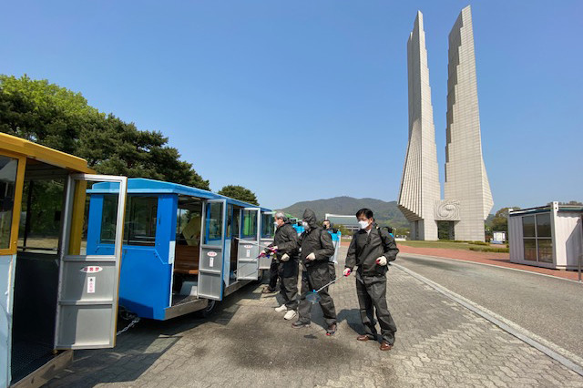 | ▲ 독립기념관 직원들이 야외 시설물에 대한 방역을 실시하고 있다. |