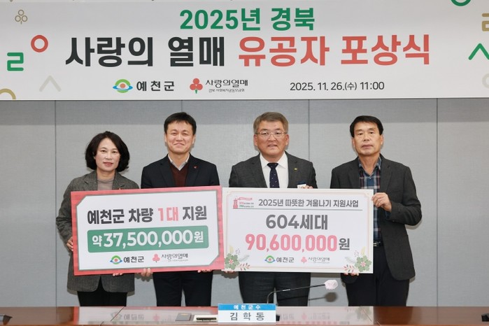 예천군은 26일 오전, 경북사회복지공동모금회(회장 전우헌)가 주최하는 ‘2025 경상북도 찾아가는 이웃돕기 유공자 포상식’이 예천군청에서 열렸다고 밝혔다.