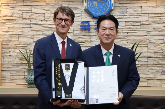 | ▲ 이동섭 국기원장(오른쪽)이 필립 베르투(Philippe Bertoux) 주한 프랑스 대사(왼쪽)에게 명예 6단증을 수여한 후 기념 촬영을 했다. |