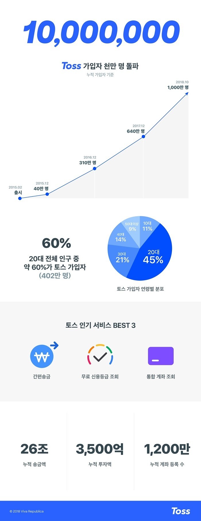 토스는 지난 2015년 간편 송금 서비스를 개시해 가입자 1000만명(2018년 12월 기준), 누적 송금액 28조원을 넘기며 `종합 금융 플랫폼`으로 자리 잡고 있다.