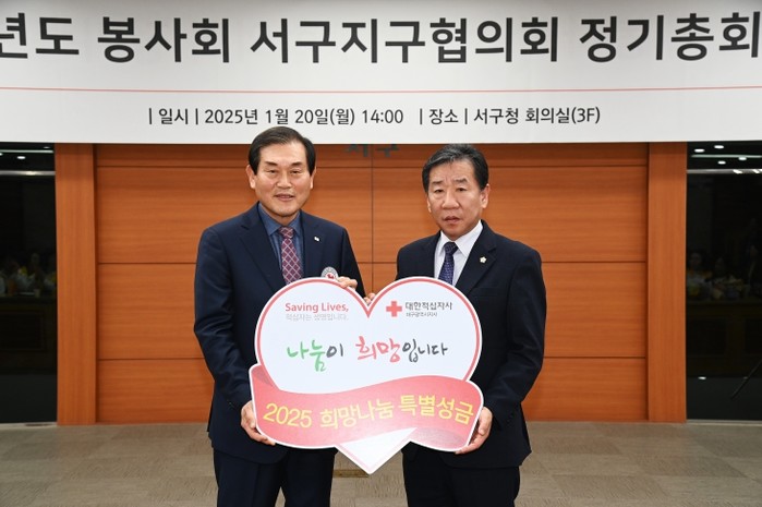 대구 서구의회는 20일 대한적십자사봉사회 대구서구협의회 정기총회에서 대한적십자사 대구광역시지사(지사회장 박명수)에 2025년도 적십자 희망나눔 특별성금을 전달했다.