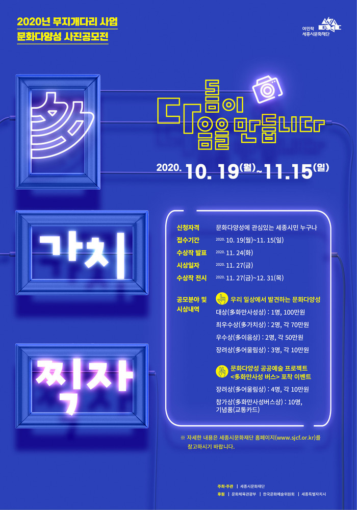 세종시문화재단(대표이사 김종률)은 19일부터 문화다양성 사진공모전 '多가치찍자'를 진행한다.