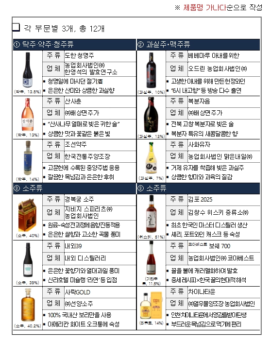 맛, 향, 빛깔 등으로만 평가하는 블라인드 테스트와 해외시장의 트렌드, 독창성・정체성 등을 반영한 서류심사로 진행된 1,2차 심사를 통해 출품 주류 중 각 부문별 3개, 총 12개가 수상작으로 선정됐다.