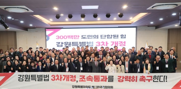 강원특별자치도 범국민추진협의회(협의회장 최양희, 추진단장 김천수)가 11월 21일 11시, 춘천 스카이컨벤션 2층 컨벤션홀에서 강원특별법 3차개정 조속 통과 촉구 결의대회를 개최했다.