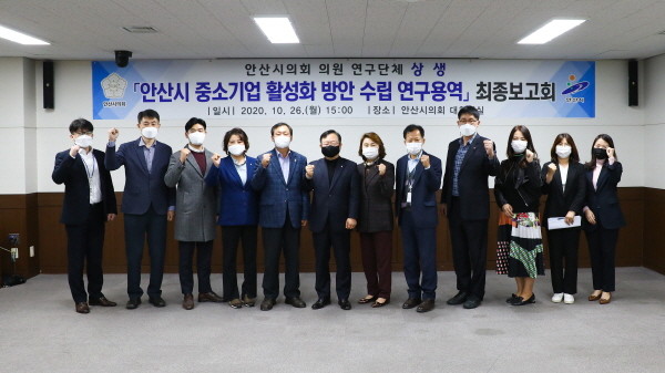 ▲‘상생’이 지난 10월26일 의회 대회의실에서 안산시 중소기업활성화 방안 수립 연구용역 최종보고회를 개최했다. 사진은 보고회 후 기념촬영에 임하고 있는 참석자들의 모습. |