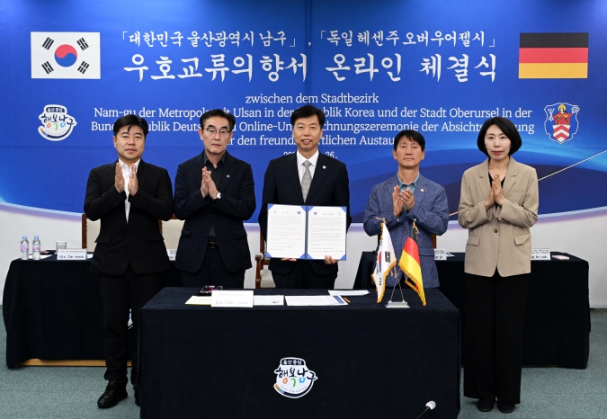 울산 남구(구청장 서동욱)와 독일 헤센주 오버우어젤시(시장 안체룽에)는 26일 도시 간 우호교류 및 공동발전을 위한 온라인 비대면 방식을 통한 우호교류의향서(MOU)를 체결했다.