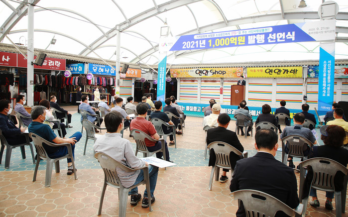 맹정호 서산시장은 21일 동부시장 내 쌈지공원에서 ‘2021년 서산사랑상품권 1000억원 발행 선언식’을 개최했다.