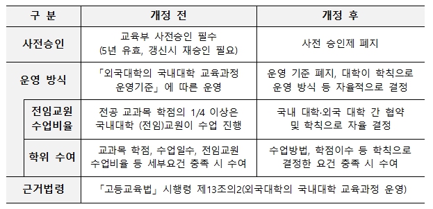 | ▲ 외국 대학의 국내 대학 교육과정 운영(프랜차이즈) 주요 변경 내용 |
