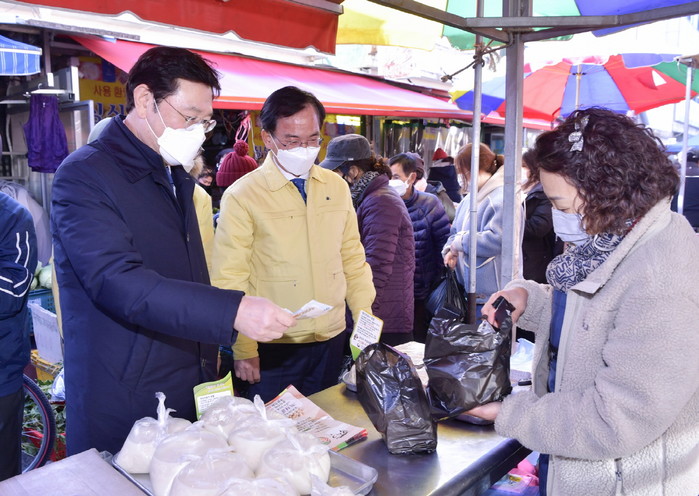 이에 이 시장은 상인들을 격려하고 설 명절 전통시장 활성화를 위한 다양한 시책을 설명했다.