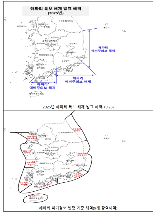 이는 국립수산과학원이 전남 남해 앞바다, 부산·경남 남해 앞바다, 울산·경북 동해 앞바다에 발표한 해파리 특보를 10월 28일 16시부로 전면 해제한 것에 따른 조치이다.