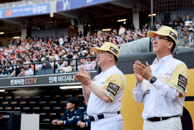 조원휘 대전시의회 의장과 이장우 대전시장이 7일 대전 한화생명 볼파크에서 열린 한화와 삼성 경기에 앞서 각각 시타와 시구를 선보이며 새 야구장 개장을 축하했다.