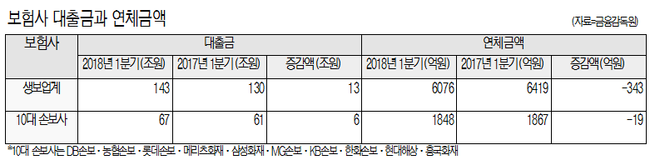 20일 금융감독원에 따르면 지난 1분기 국내 23개 생명보험사의 대출채권은 143조원으로 전년 동기(130조원)에 비해 10% 늘어난 반면 1분기 연체금액은 6076억원으로 전년 동기(6419억)원에 비해 5% 감소했다. 손해보험사도 대출채권은 같은 기간 61조원에서 67조원으로 10% 증가했으나, 연체금액은 1867억원에서 1848억원으로 1% 감소했다.