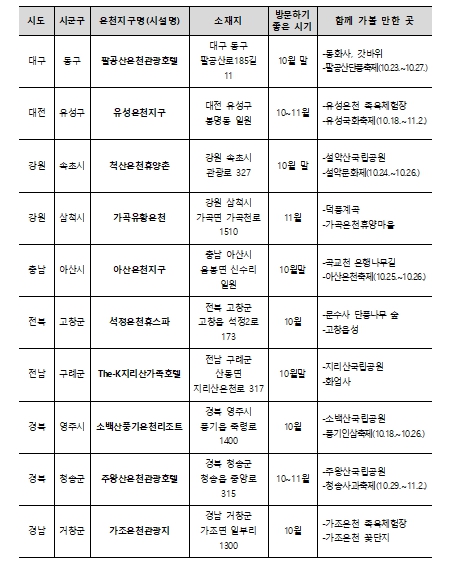 가을철 찾기 좋은 온천 10곳에 대한 자세한 정보는 ‘한국온천협회 누리집’에서 확인할 수 있다.
