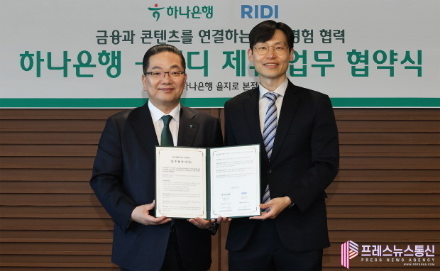 [프레스뉴스] 류현주 기자= 하나은행(은행장 이호성)은 지난 10일 오후 을지로 본점에서 국내 대표 콘텐츠 플랫폼 기업 리디(RIDI) 주식회사(대표 배기식, 이하 ‘리디’)와 새로운 손님 경험 제공을 위한 업무협약을 체결했다고 밝혔다.