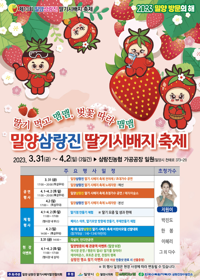 또한 딸기맥주, 딸기막걸리, 딸기스파클링와인 등을 맛볼 수 있는 무료시음행사와 매직마술쇼, 버블쇼, 에어바운스, SNS 인증 이벤트, 2023 밀양방문의 해 관광홍보 부스 운영 등 다양한 즐길거리가 준비돼 있다.