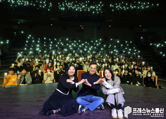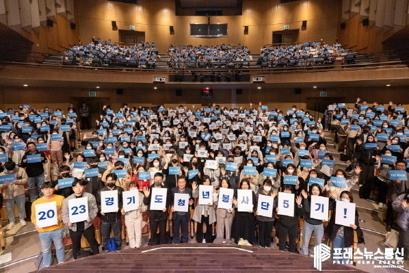 | ▲ 4일 오후 경기아트센터 소극장에서 김동연 경기도지사, 권석필 경기도자원봉사센터 센터장, 박아람 경기도 청년봉사단 5기 단장, 이지은 경기도 청년봉사단 5기 부단장 등 청년봉사단 500여명이 2023 경기도 청년봉사단 5기 발대식 퍼포먼스 기념촬영을 하고 있다.(사진=경기도) |