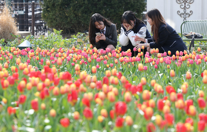 | ▲22일 경기 용인시 에버랜드 포시즌스가든을 찾은 시민들이 튤립 사이에서 즐거운 시간을 보내고 있다.(사진= 뉴스1) |