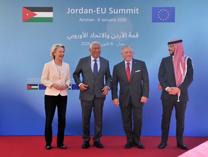 [프레스뉴스] 채정병 특파원=8일(현지시간) 요르단-유럽연합(EU) 정상회의 참석을 위해 요르단을 방문한 우르줄라 폰데어 라이엔(왼쪽 첫번째) 유럽연합 집행위원장, 안토니우 코스타(왼쪽 두번째) 유럽연합 정상회의 상임의장, 압둘라 2세(왼쪽 세번째) 요르단 국왕, 후세인(왼쪽 네번째) 요르단 왕세자가 밝은 표정으로 기념사진을 찍고 있다. 이번 정상회의는 2025년 1월에 요르단과 유럽연합이 맺은 전략적, 포괄적 파트너십 협정의 틀 안에서 양자간의 정치, 경제협력을 강화하는 방안에 중점을 두고 진행됐다. 유럽연합은 협정에 따라 2025년부터 2027년까지 요르단에 투자 등 30억 유로의 재정을 지원한다.